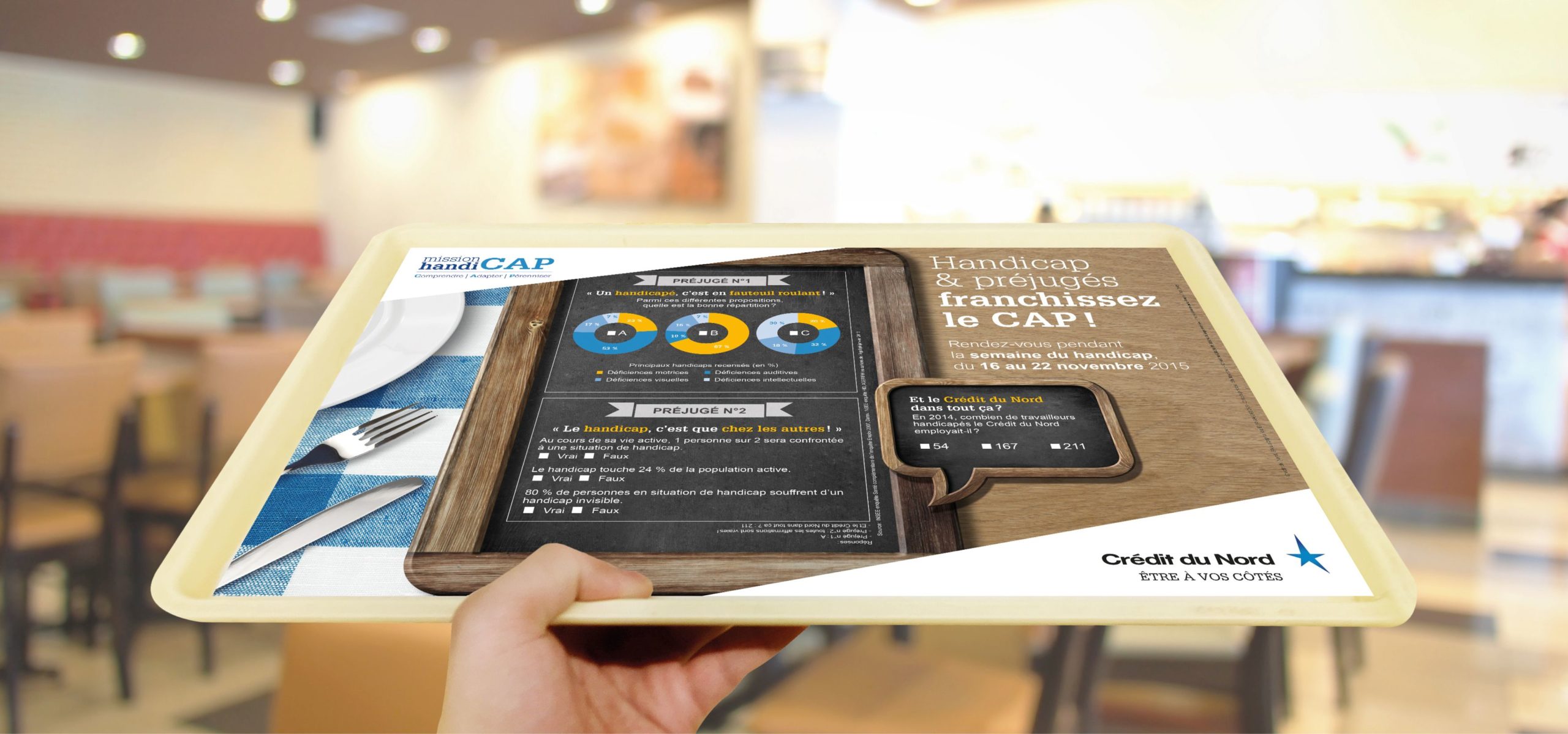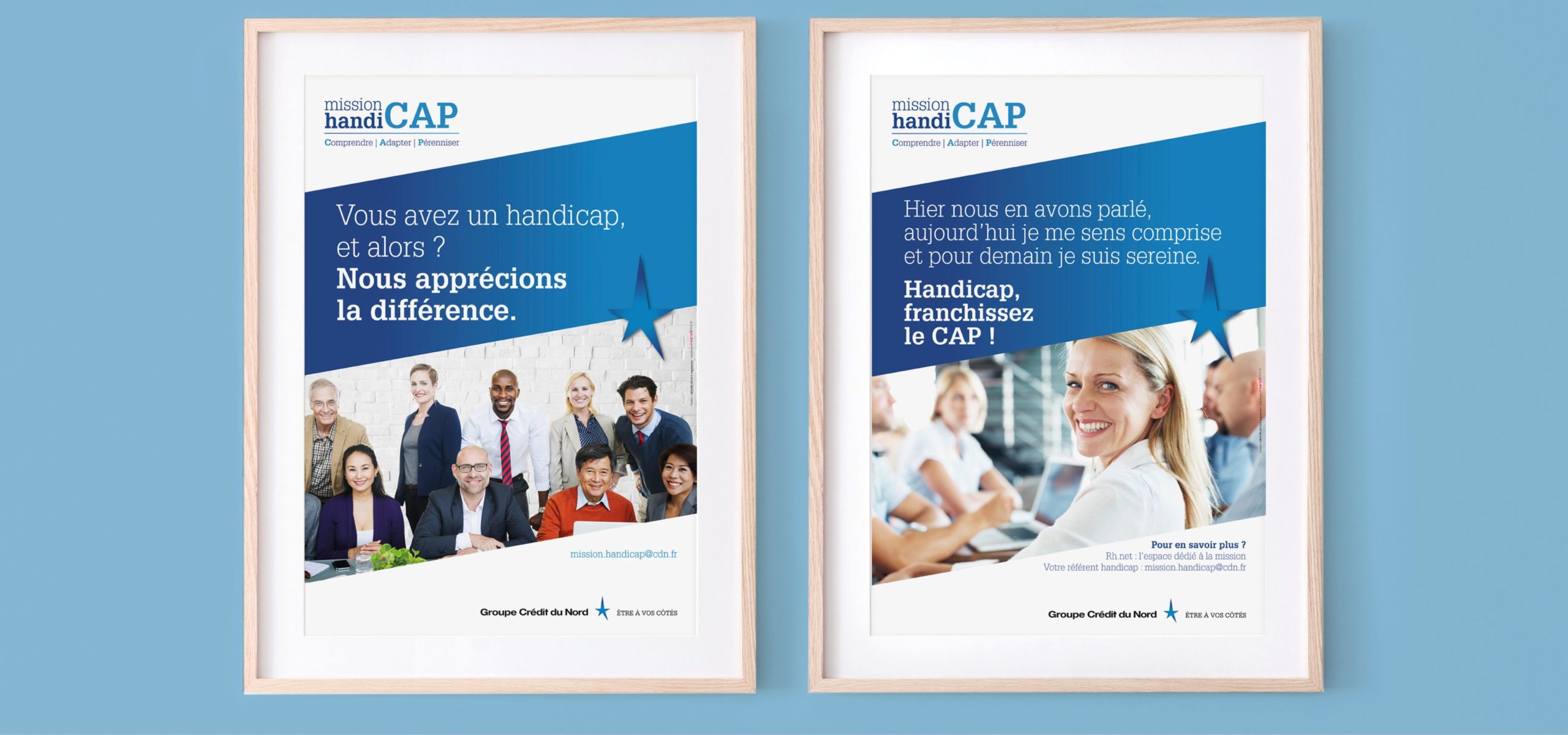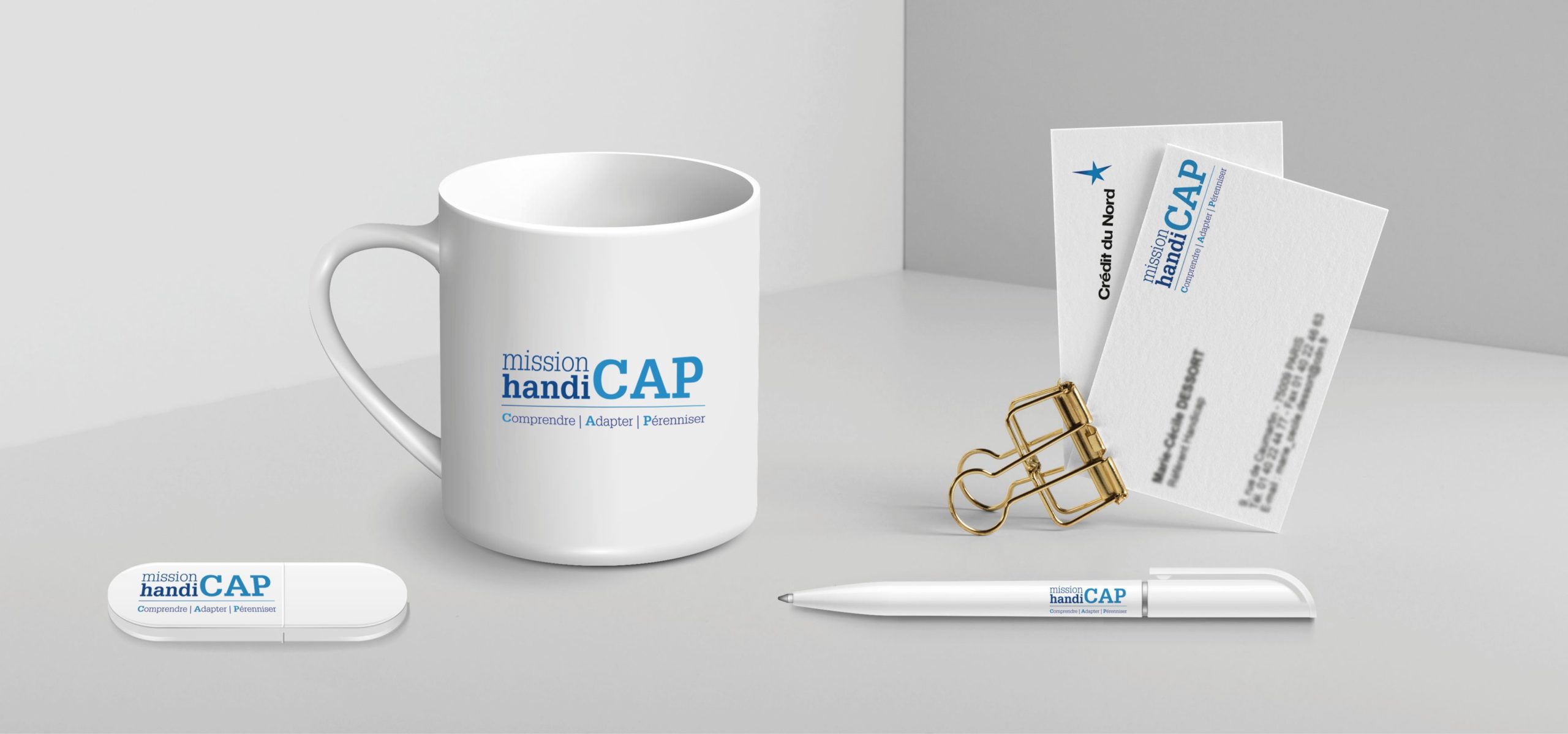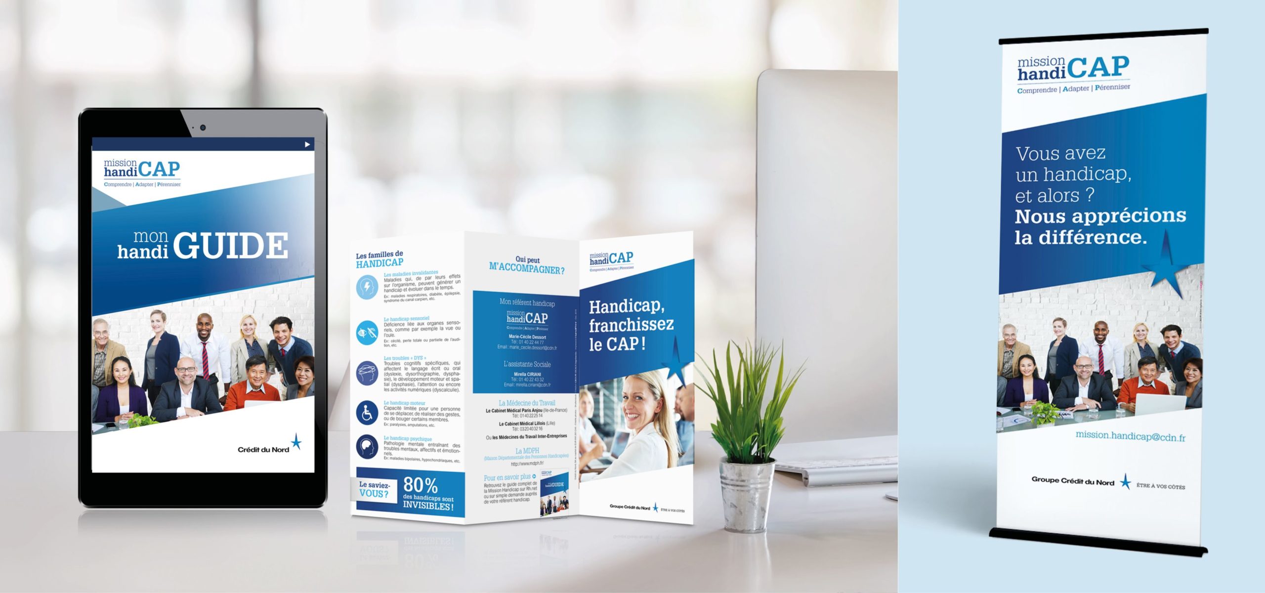 La mission handicap du Crédit du nord, créée en 2008, a pour objectifs de Comprendre les collaborateurs en situation de handicap, Adapter leur environnement de travail et Pérenniser les actions menées [CAP]. Dans cette dynamique, nous avons réalisé une identité visuelle et des outils de communication en adéquation avec la charte du Groupe.