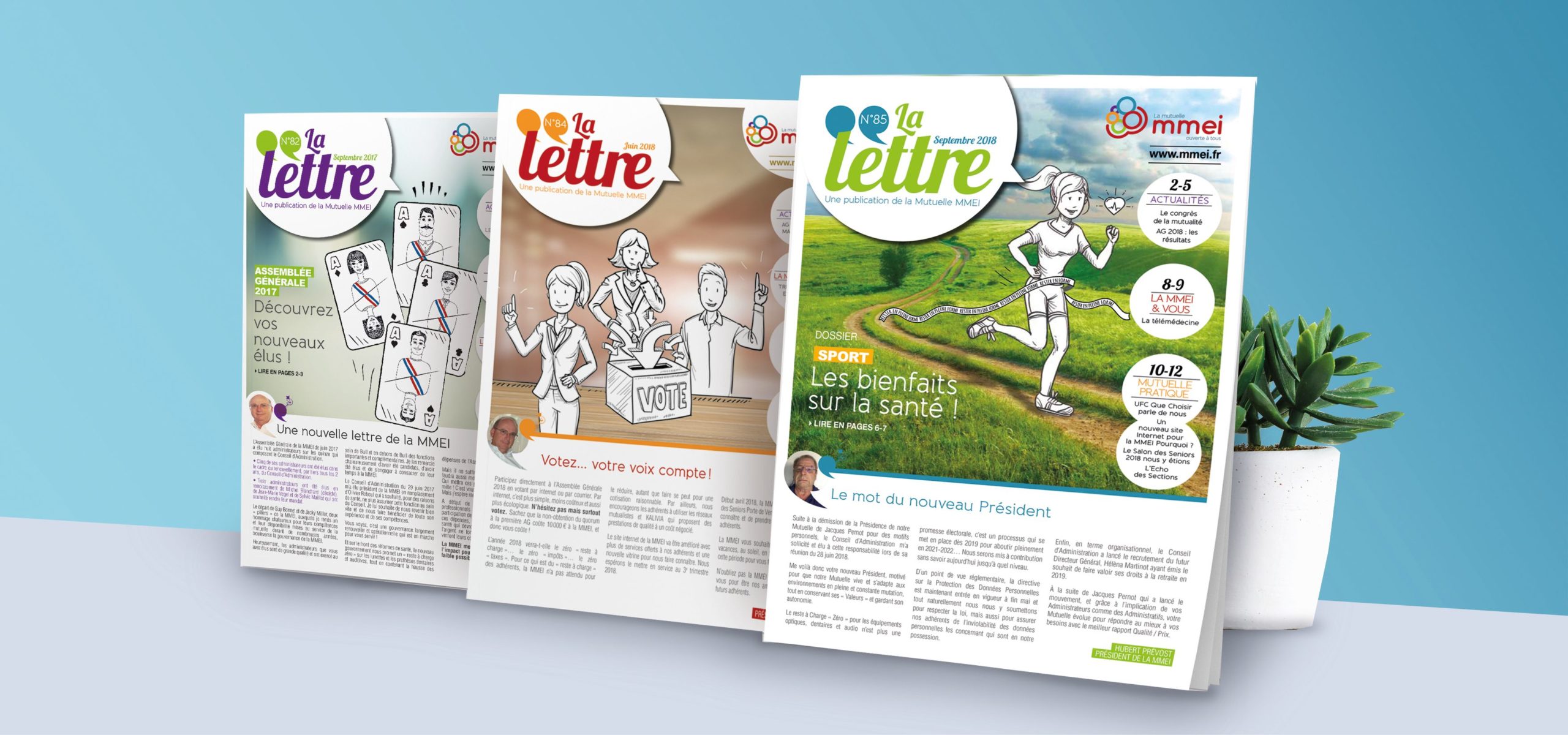 La MMEI « se voit pousser des ailes » avec un nouvel environnement graphique plein de fraîcheur ayant à cœur de positionner l’adhérent au centre de sa communication. Des adhérents illustrés et une maquette colorée rendent par exemple, 3 fois par an, La Lettre accessible, pour une mutuelle ouverte à tous !